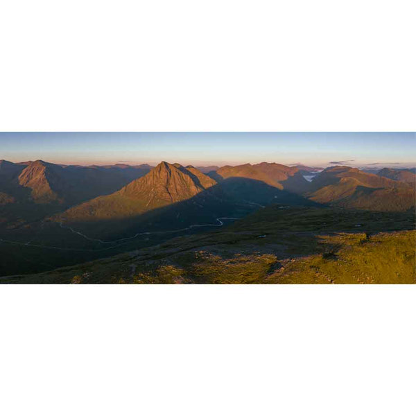 This sunrise photo from Beinn a'Chrulaiste captures the iconic Buachaille Etive Mor with dramatic shadows and vibrant morning light. Featuring the scenic A82 through Glen Coe and a nod to James Bond's Skyfall, this image brings a touch of adventure to any space. Ideal for living rooms, offices, or mountain-themed decor.