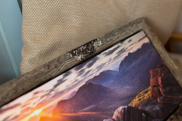 Although our canvases can stand alone as finished pieces for your wall we also add various styles of frame to increase their impact. We like to use local materials with an interesting story and a strong link to the landscape.
