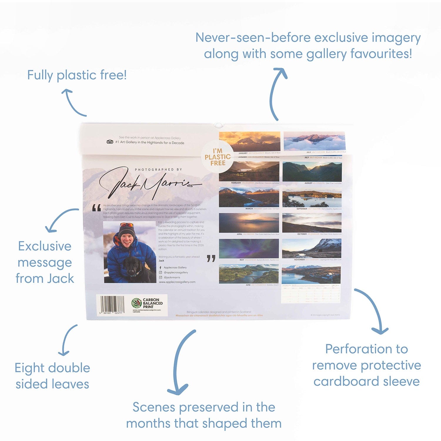 Bilingual - Key aspects of this calendar are now translated into Gaelic, a language entwined so deeply with the cultural heritage and history of the landscapes contained within the calendar's pages that it feels only right to celebrate it in this way. (Don't worry, we have kept the English as well!)