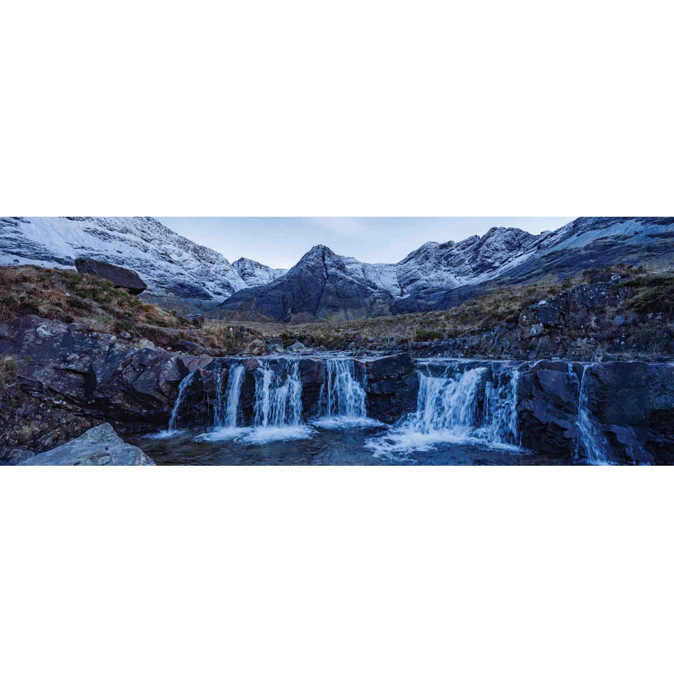 Taken in January, the snow dusted Cuillin Hills of Bruach na Frìthe, Sgùrr na Bàirnich and Sgùrr an Fheadain tower above this picturesque series of waterfalls, the Fairy Pools.